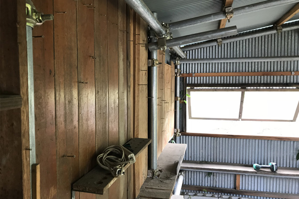屋根の長手方向(画像左から右)に通っている垂木は奥行き方向のパイプに「垂木クランプ」なるものを使って固定してから、その垂木に波板を貼っています。側面、背面も上端と中段2カ所、下の方と計4箇所の高さに垂木クランプで下地(横桟)を入れていきました。