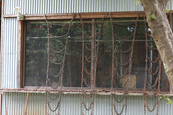 正面入り口は大きい雨戸が庭に落ちていたので流用しました。手前左側は固定で、右側が動く様になっています。少し背が低い様に見えますが、雨戸が左右に動くガイドとして薄い木材でサンドイッチしているためそう見えるだけです。雨戸の色は塗ろうかとも思ったんですが、大家さんが使うかもしれないとの事で断念…。パイプの端はふつう黄色いエンドキャップを付けますが、どうにも格好悪くてパイプと同じ色と素材のものがあればと思いましたが当時はなかったので付けてません。